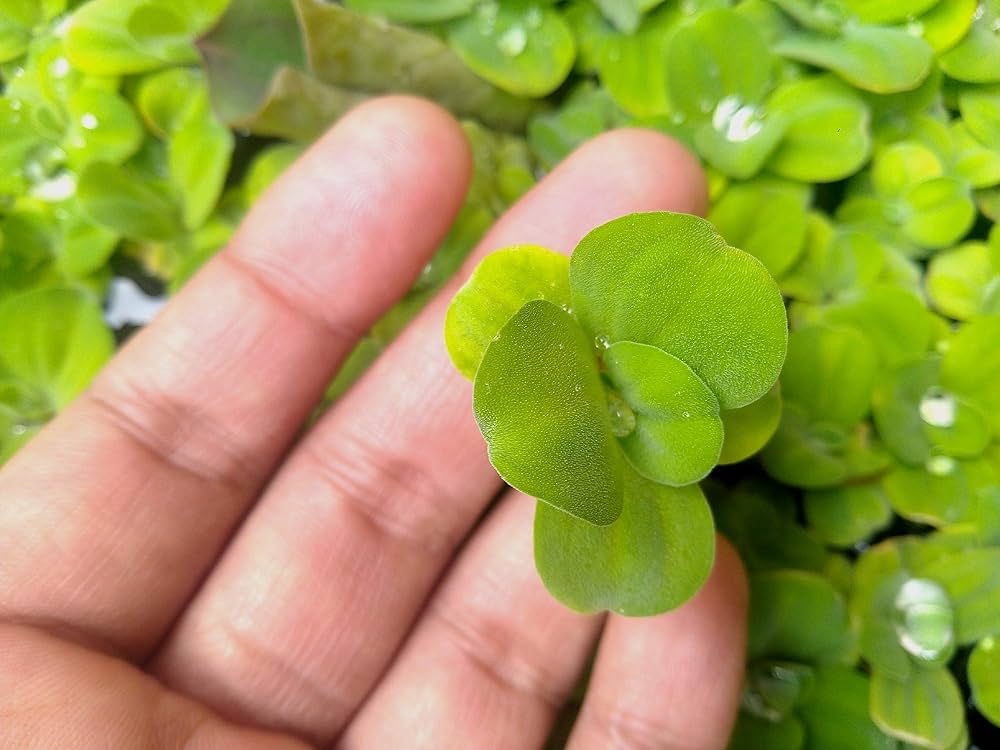 Clusters of green, oval-shaped leaves floating on the surface with short roots dangling beneath.