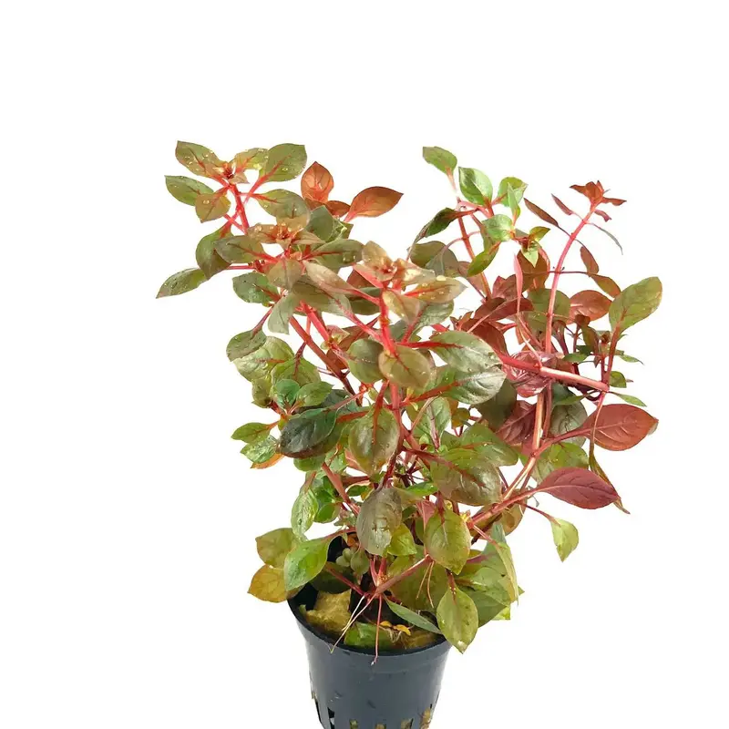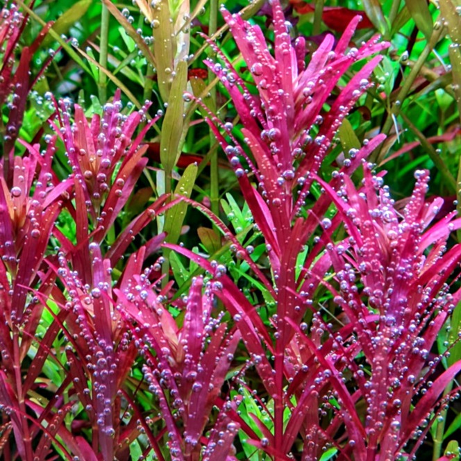 Elongated red leaves that intensify under higher light. Forms bushy, colorful clusters along stems.